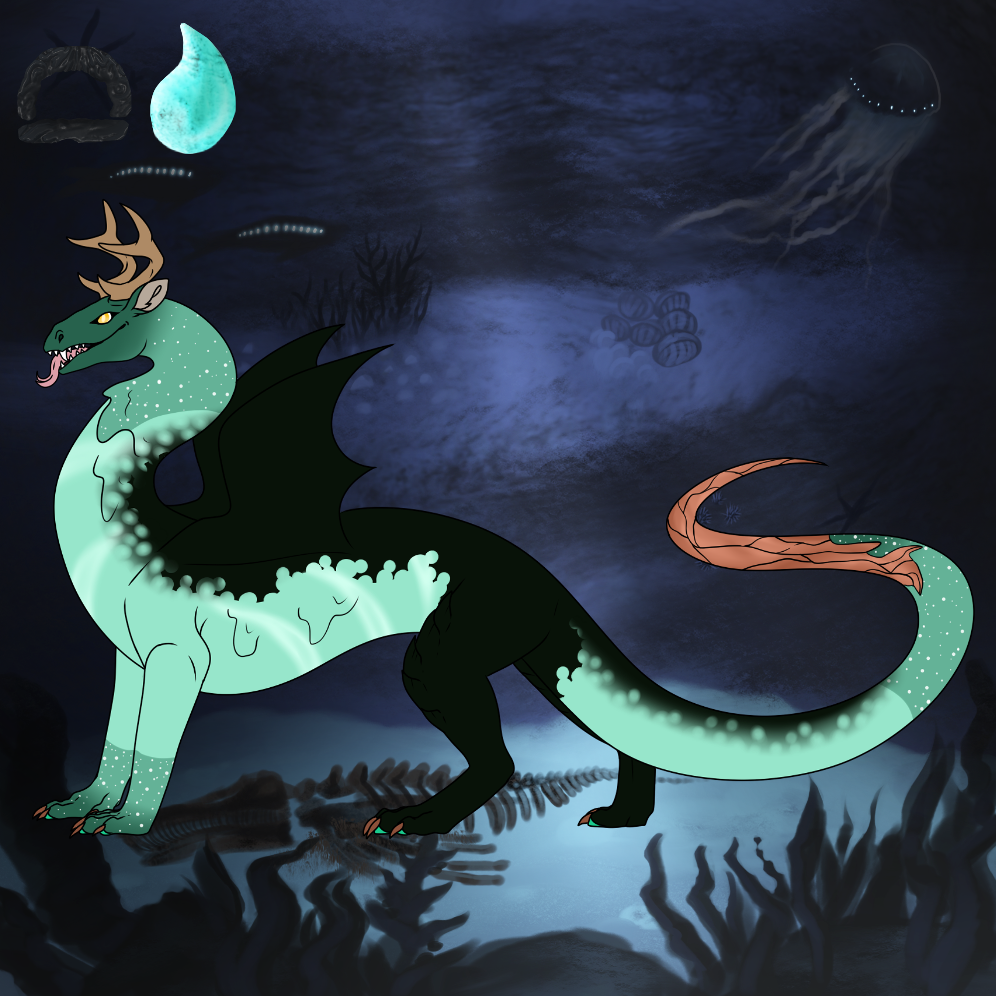 Physical Traits: Monstrous Snout, Crowned Crest, Monstrous Body, Smooth Scales, Leather Wings, Amphibious Limbs, Whip Tail